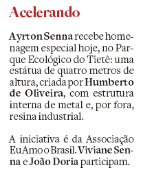 Ayrton Senna recebe homenagem especial hoje, no Parque ecológico do Tietê: uma estátua de quatro metros de altura, criada por Humberto de Oliveira, com estrutura interna de metal e, por fora, resina industrial.