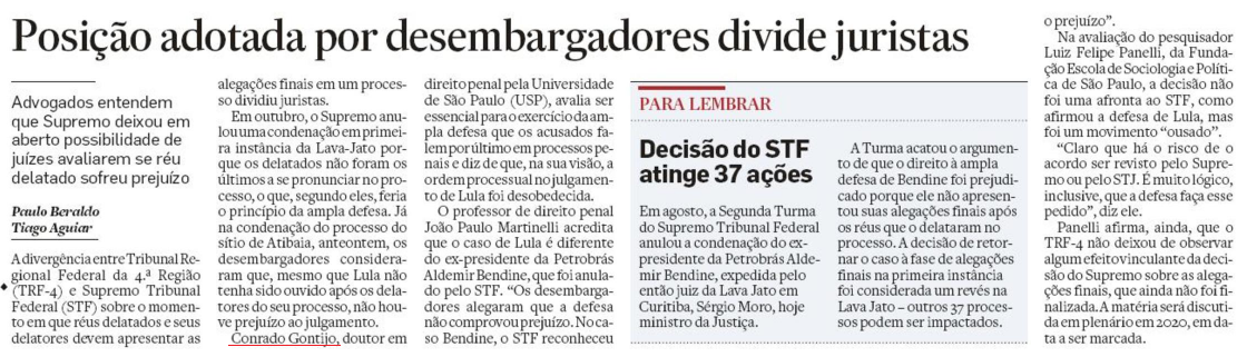 Na avaliação do pesquisador Luiz Felipe Panelli, da Fundação Escola de Sociologia e Política de São Paulo, a decisão não foi uma afronta ao STF, como afirmou a defesa de Lula, mas foi um movimento “ousado”.  Ele discorda da avaliação de que o processo deva ser anulado porque não vê irregularidades em sua condução.