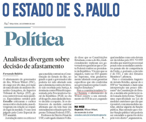 Para a constitucionalista Vera Chemim, o afastamento de Witzel remete a um entendimento do STF de 2017, segundo qual medidas como esta devem ser decididas pelo STJ. “O STF decidiu que matéria processual penal como as medidas cautelares penais são de competência da União, e, portanto, a decisão é do STJ, e não dos Estados Membros”, afirmou.