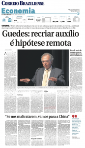 O ministro argumentou que o auxílio emergencial é uma “ajuda transitória”, criada para o enfrentamento da pandemia da covid-19. E indicou que, apesar de os casos e as mortes estarem voltando a ganhar força em alguns locais do país, o governo brasileiro não acredita no risco de uma segunda onda de contaminações, ao contrário do ele havia dito na quinta-feira. “Do lado da pandemia, o Brasil está conseguindo combater a doença e a vacina está chegando. É um fato que está acontecendo do lado da saúde. E, do outro lado, da economia, é um fato que o Brasil está saindo da recessão”, declarou.