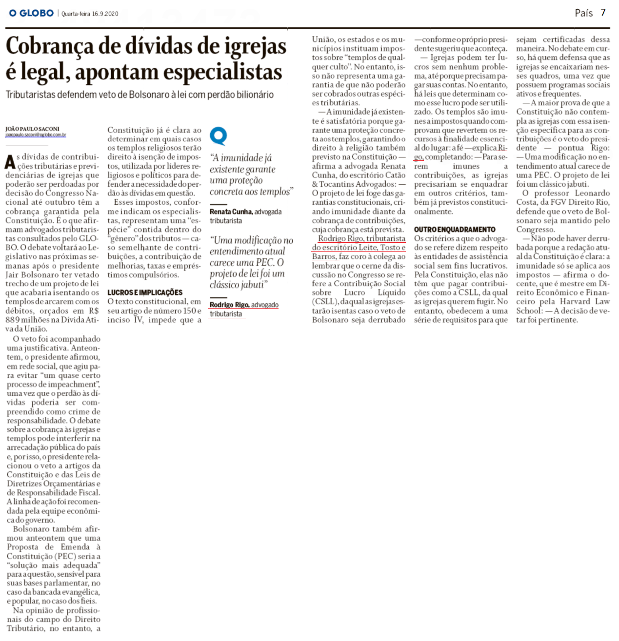 As dívidas de contribuições tributárias e previdenciárias de igrejas que poderão ser perdoadas por decisão do Congresso Nacional até outubro têm a cobrança garantida pela Constituição. É o que afirmam advogados tributaristas consultados pelo GLOBO. O debate voltará ao Legislativo nas próximas semanas após Jair Bolsonaro ter vetado trecho de um projeto de lei que acabaria isentando os templos de arcarem com os débitos, orçados em R$ 889 milhões na Dívida Ativa da União. O próprio presidente recomendou, no entando, que os parlamentares derrubem sua decisão.