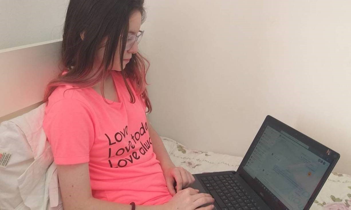 Bruna Macruz, de 14 anos, começou a ter aulas à distância no mesmo dia em que as escolas foram fechadas, por determinação do governo do estado, em 23 de março passado. Aluna do 9º Ano do Ensino Fundamental, ela estuda desde o maternal na Escola Bosque, na zona sul de São Paulo.