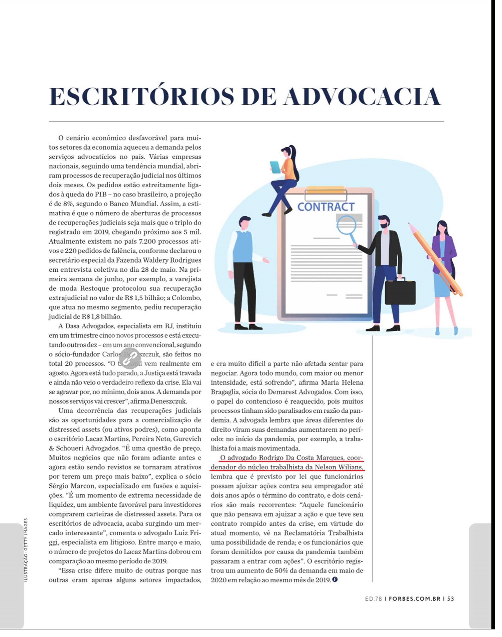 “(…)O advogado Rodrigo da Costa Marques, coordenador do núcleo trabalhista da Nelson Wilians, lembra que é previsto por lei que funcionários possam ajuizar ações contra seu empregador até dois anos após o término do contrato. e dois cenários são mais recorrentes: “aquele funcionários que não pensava em ajuizar a ação e que teve seu contrato rompido antes da crise, em virtude do atual momento, vê na Reclamatória Trabalhista uma possibilidade de renda, e os funcionários que foram demitidos por causa da pandemia também passaram a entrar com ações”. O escritório registrou um aumento de 50% da demanda em maio de 2020 em relação ao mesmo mês de 2019.”