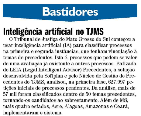 O Tribunal de Justiça do Mato Grosso do Sul começou a usar Inteligência Artificial (IA) para classificar processos na primeira e segunda instâncias, que tenham vinculação à temas de precedentes. Isto é, processos que podem se valer de uma avaliação já existente a outros processos.