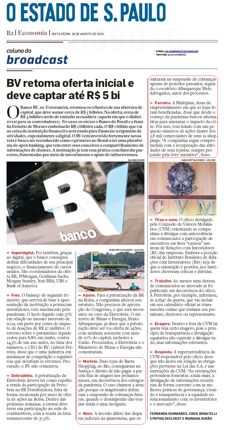 Isenções. A Multiplan afirmou que, voluntariamente reduziu os aluguéis em 50% em março, quando os shoppings foram fechados a partir da segunda quinzena, e isentou em 100% nos meses seguintes, quando os locais permaneceram sem receber o público. Fora isso, cortou a cobrança do condomínio pela metade e isentou os fundos de promoção. “A companhia segue comprometida com a recuperação das atividades de seus lojistas, sempre prezando pela livre iniciativa”, disse.