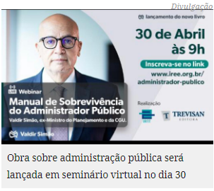 Será lançado no próximo dia 30, em um seminário virtual, o livro Manual de sobrevivência do administrador público. O evento é promovido pelo Instituto para Reforma das Relações entre Estado e Empresa e contará com a participação de Valdir Moysés Simão (ex-ministro do planejamento e da CGU).
