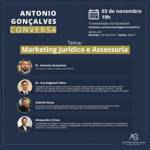 O advogado Antonio Gonçalves, doutor e mestre pela PUC-SP, debate marketing jurídico e assessoria de imprensa com convidados. Participam o advogado e professor Ary Raghiant Neto, com atuação em Mato Grosso do Sul, o jornalista e sócio da agência DeepContent, Gabriel Attuy, e Alessandro Cristo, jornalista e coordenador da Original 123 Comunicação.