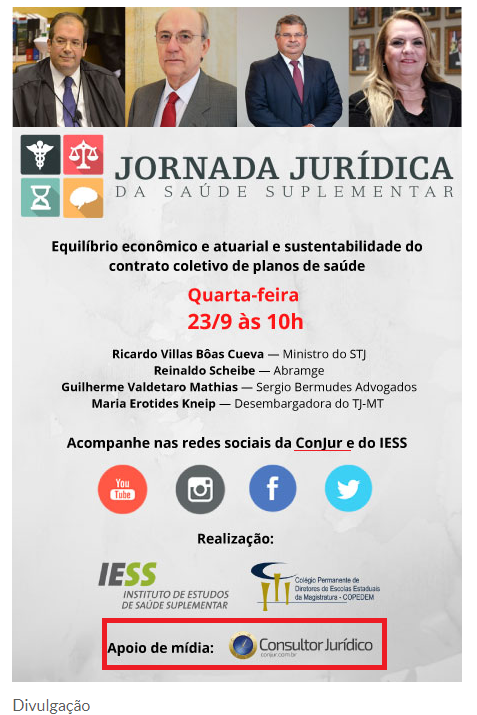 O equilíbrio econômico e atuarial e a sustentabilidade dos contratos coletivos dos planos de saúde serão discutidos, a partir das 10h desta quarta-feira, 23, na 1ª Jornada Jurídica de Saúde Suplementar. O debate será transmitido ao vivo pelas redes sociais da TV Conjur e do Instituto de Estudos de Saúde Suplementar (IESS), que organizam o evento ao lado do Colégio Permanente de Diretores de Escolas Estaduais da Magistratura (Copedem).