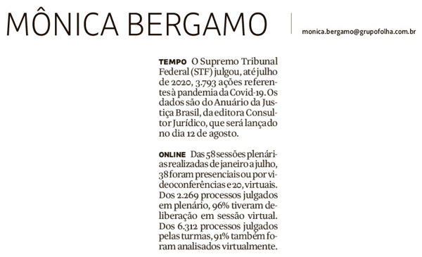 O Supremo Tribunal Federal (STF) julgou, até julho de 2020, 3.793 ações referentes à pandemia da Covid-19. Os dados são do Anuário da Justiça Brasil, da editora Consultor Jurídico, que será lançado no dia 12 de agosto.
