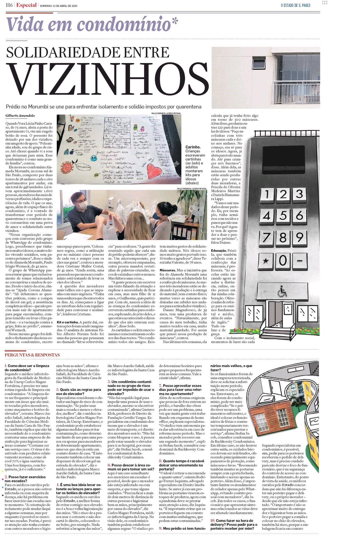 No Alameda Morumbi, condomínio de 1.600 moradores na zona sul de São Paulo, moradores montaram “kits de sobrevivência” para os idosos, confeccionaram máscaras para quem precisava, ofereceram reforço escolar, passeios para os pets e música coletiva, para deixar a quarentena mais suave. Até as crianças se envolveram nas ações e escreveram cartinhas para os mais velhos, explicando que eles não estavam sozinhos logo agora.